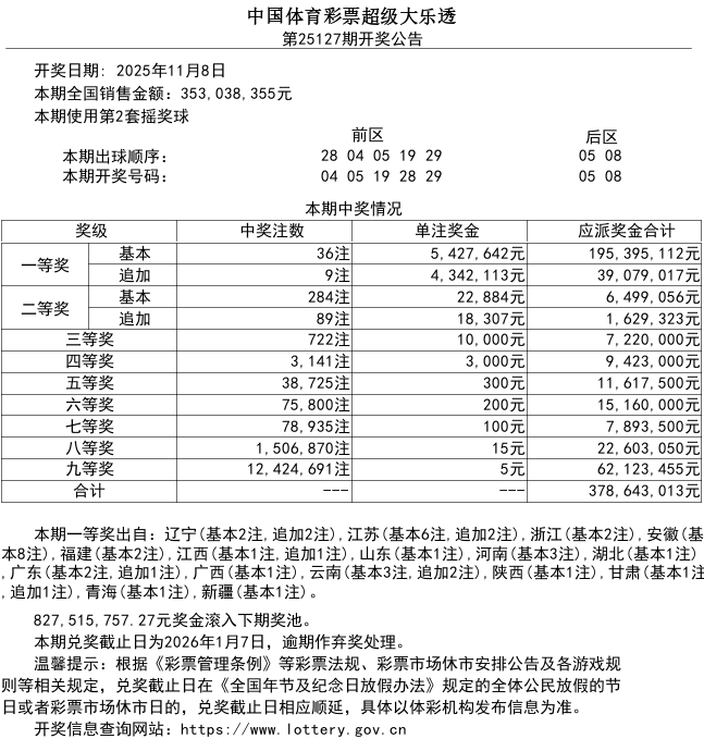 超级大乐透游戏第25127期开奖公告