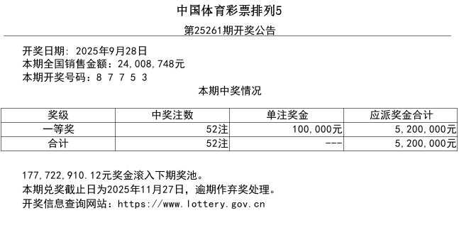 排列5游戏第25261期开奖公告