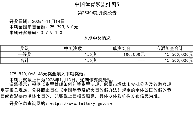 排列5游戏第25304期开奖公告