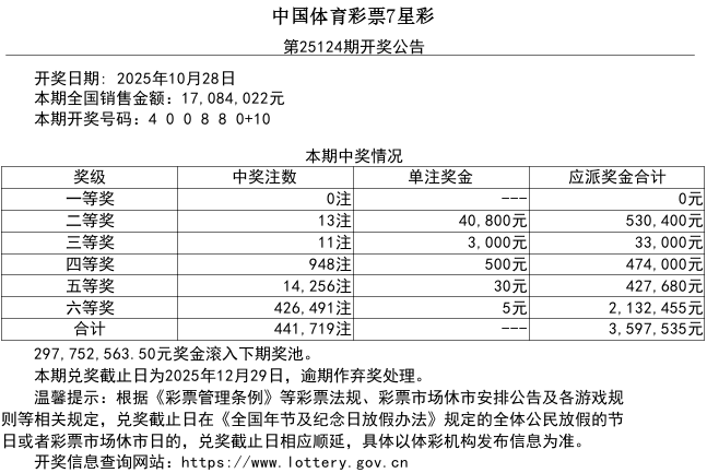 7星彩游戏第25124期开奖公告